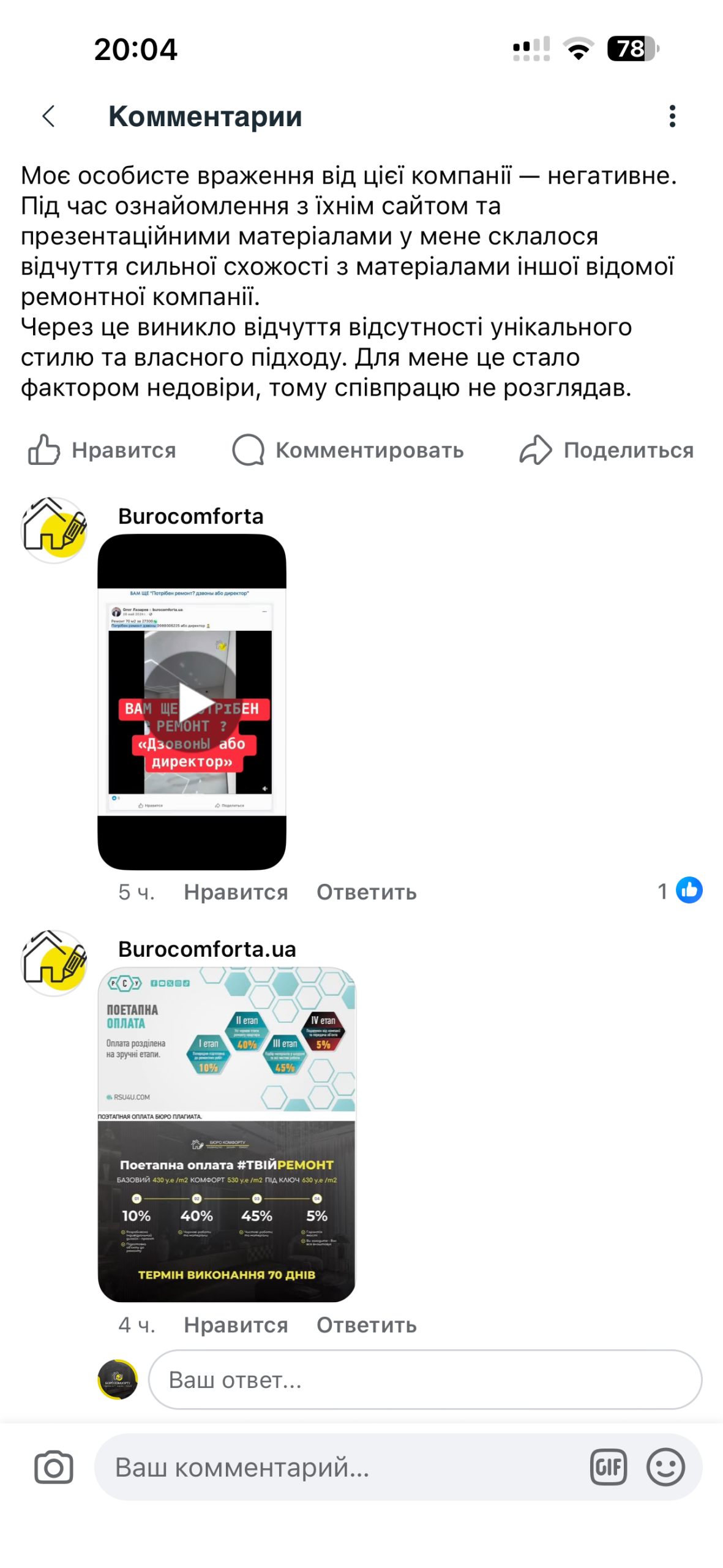 - створення фейкової сторінки у Facebook, що використовує назву нашої компанії англійською мовою та офіційну візуальну айдентику (логотипи), з подальшим поширенням із цієї сторінки негативних та дискредитаційних коментарів на офіційній сторінці «Бюро Комфорту»;