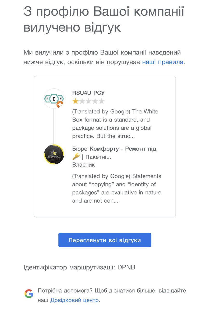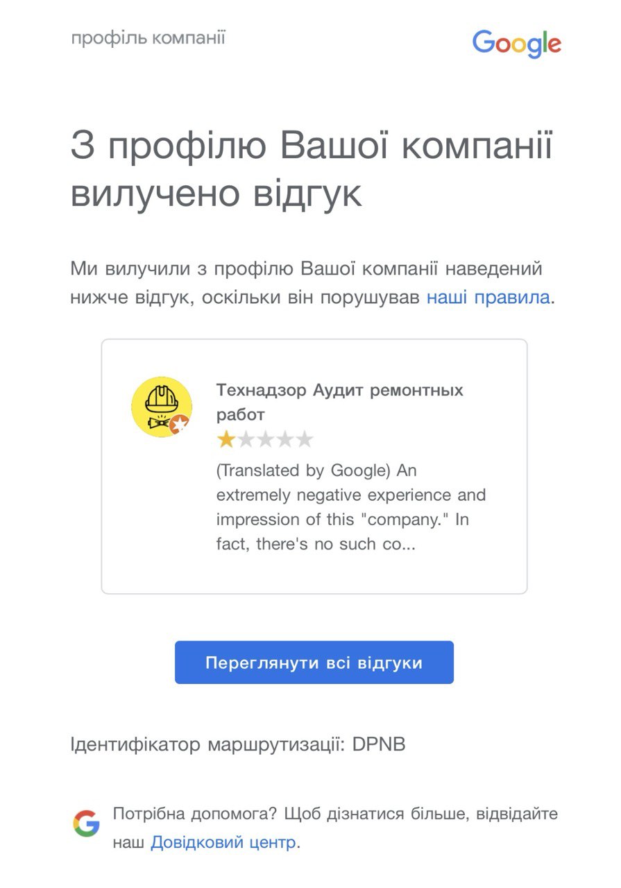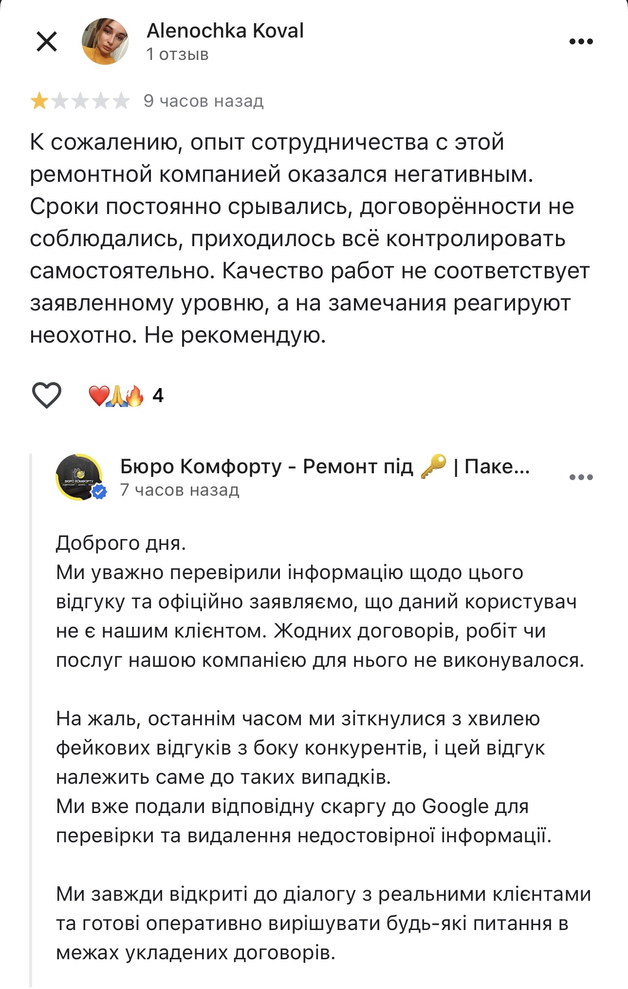 - публікацію фейкових негативних відгуків у Google Business Profile, створених із нових або мало активних облікових записів без підтвердження факту реальної співпраці з компанією;